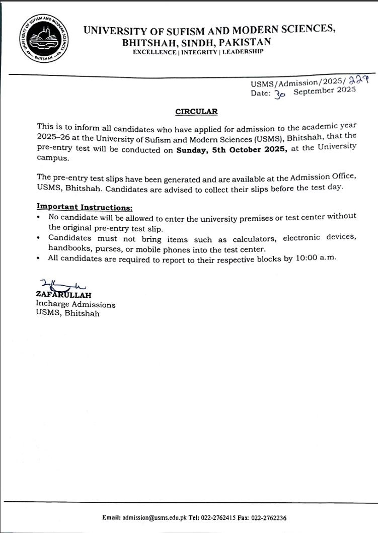 The University of Sufism and Modern Sciences (USMS) is situated in Bhitshah Town, Matiari District, home to a Shrine of the Sufi Saint HazratShah Abdul Latif Bhittai.