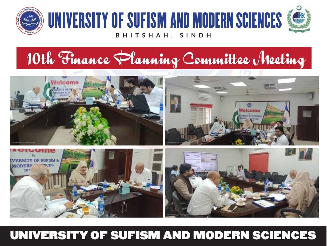 In the University of Sufism and Modern Sciences, Bhitshah first Academic Council meeting held today on 18-11-2020. All the worthy members Vice Chancellor Prof. Dr. Parveen Munshi, Deputy Registrar Aamir Kiberia, eminent members Prof. Dr. Nawaz Ali Shouq, Prof. Dr. Qurban Ali Bhutto and other Professors, Heads of Departments,Directors and faculty members participated to make the agenda successful. ...The items of the agenda of the first ever Academic Council was based on various items such as academic, examinations policies, department of English language and Literature and department of Sindhi language and Literature approved in high spirit and no stone remain unturned. Further, a remarkable initiative was taken by worthy Vice Chancellor that the degree of the University of Sufism and Modern Sciences, Bhitshah would be transcribed in English and Sindhi language as to preserve and promote our mother tongue with langua franca.