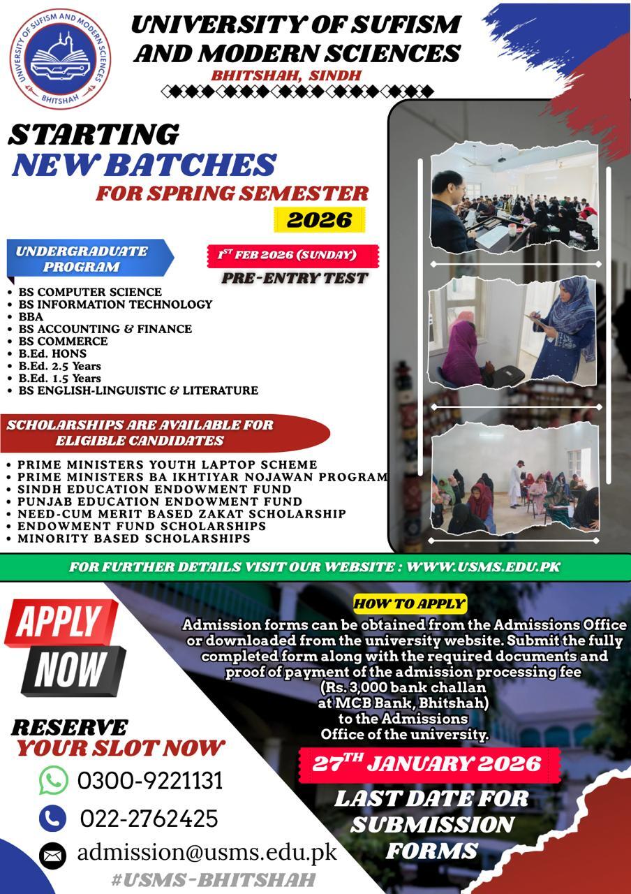 - The “online Admission Form” and “Prospectus 2025-2026” are available at University website usms.edu.pk/admission_form.html CCandidates are advised to fill the online admission form and pay the application processing fees and submit it before the deadline.
