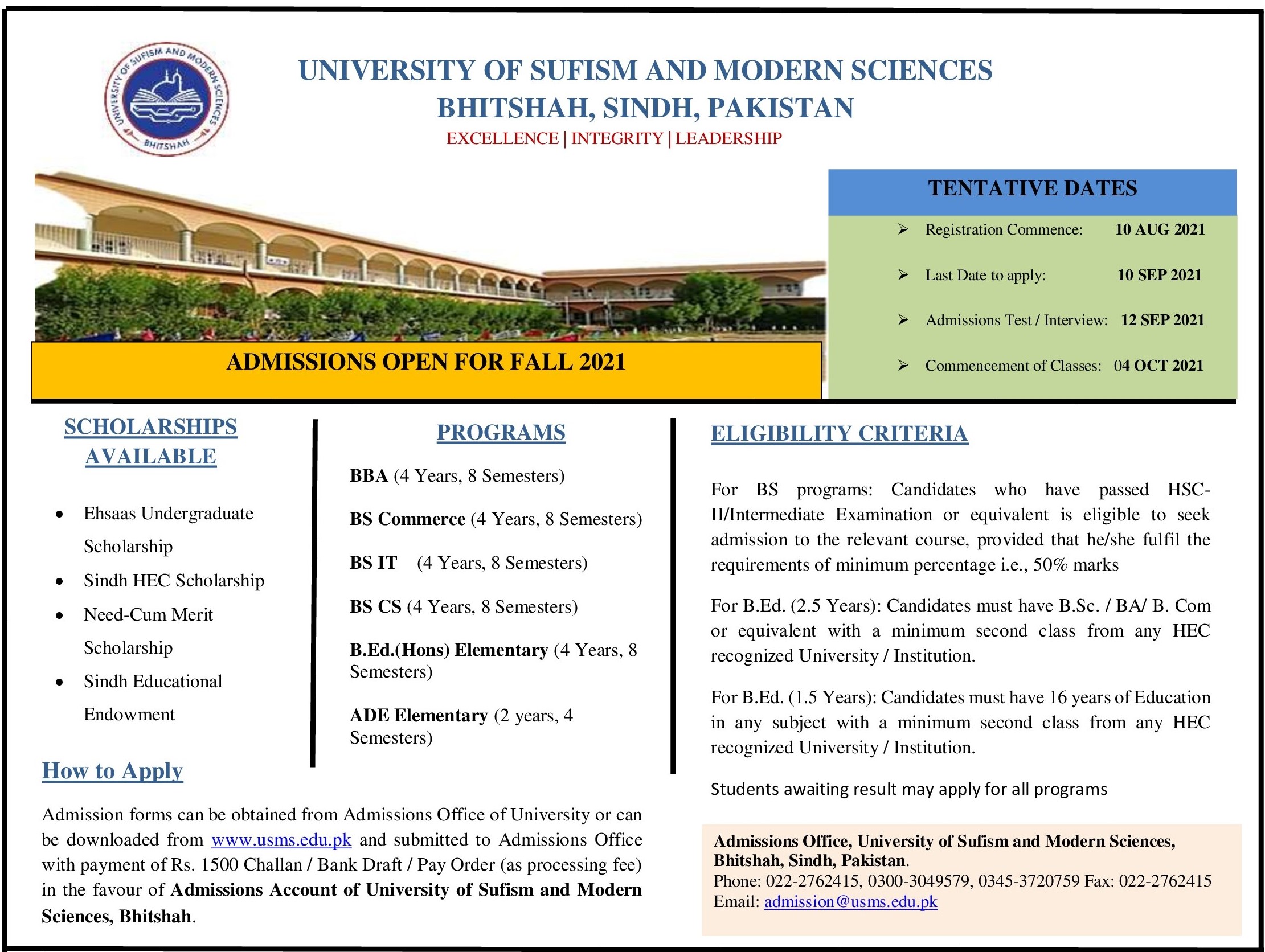 - Admissions Open For the Academic Year 2021-22 at USMS, Bhitshah.