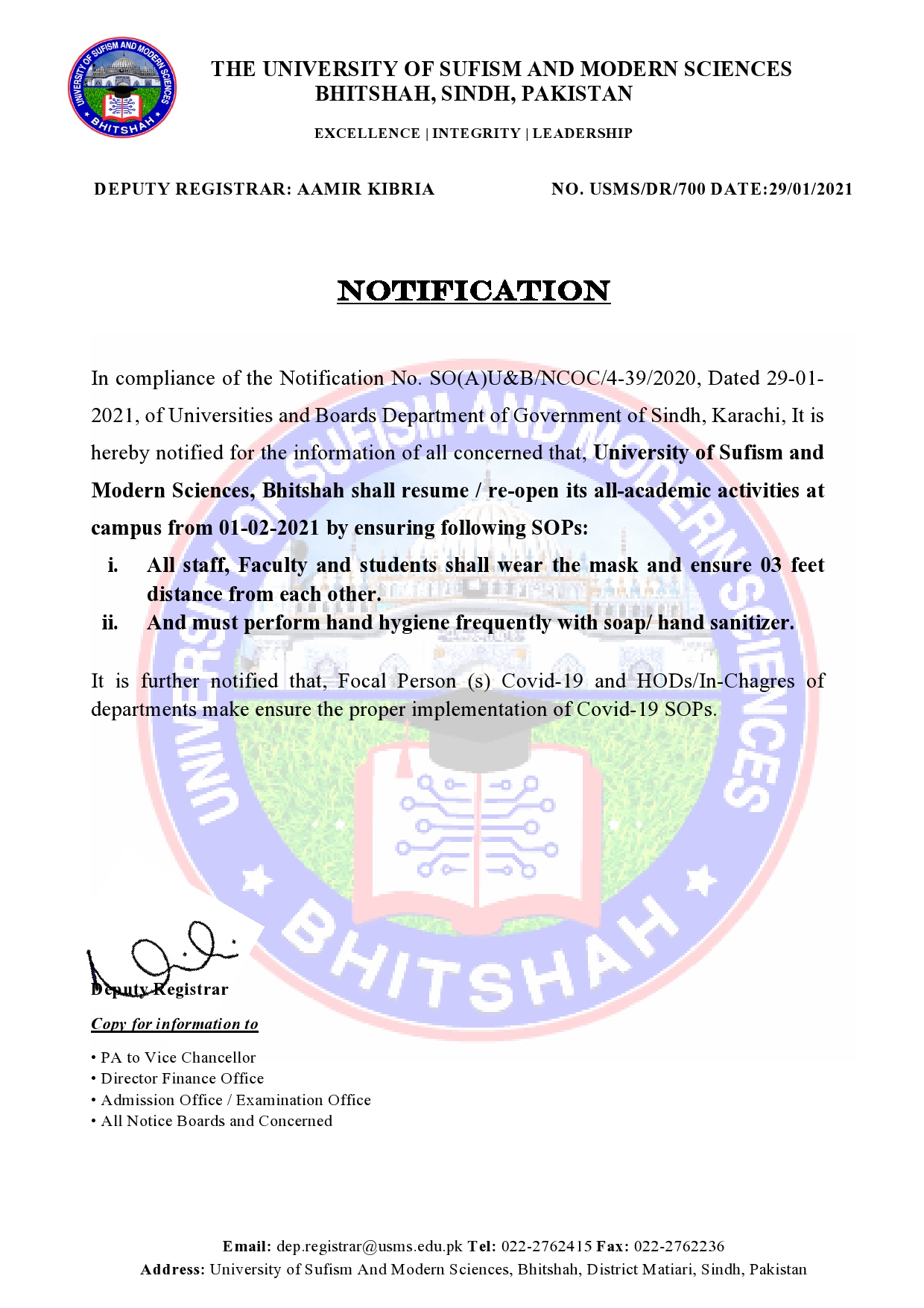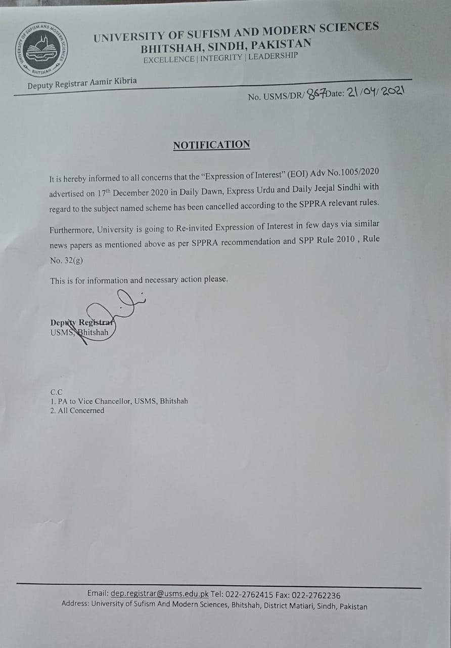 - University of Sufism & Modern Sciences Bhitshah will resume its all Academic Activities From 1st February, 2021