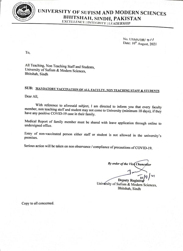 - Notification of Mandatory Vaccination for all Faculty, Non Teaching Staff & Students.